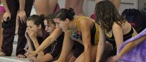 The girls were fired up before the meet began, ready to show how much they had improved in the off-season. And they did! Here’s a few great swims & dives from the meet.
