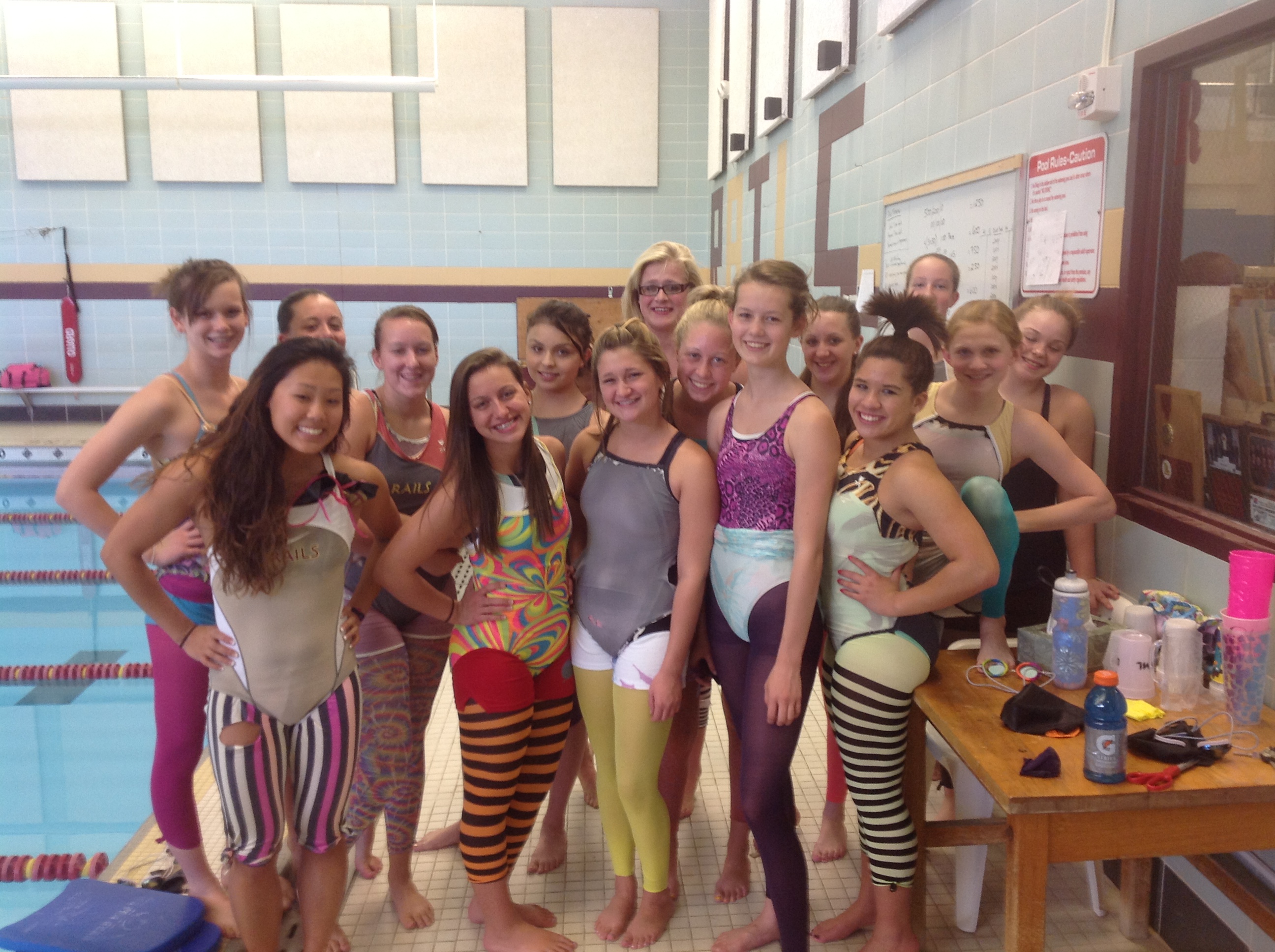 The girls’ favorite part about taper? Choosing their wacky tights and suits! They’ll even coordinate their tights for the Regionals meet. We’ve had a great season so far and are excited to see what taper will bring!